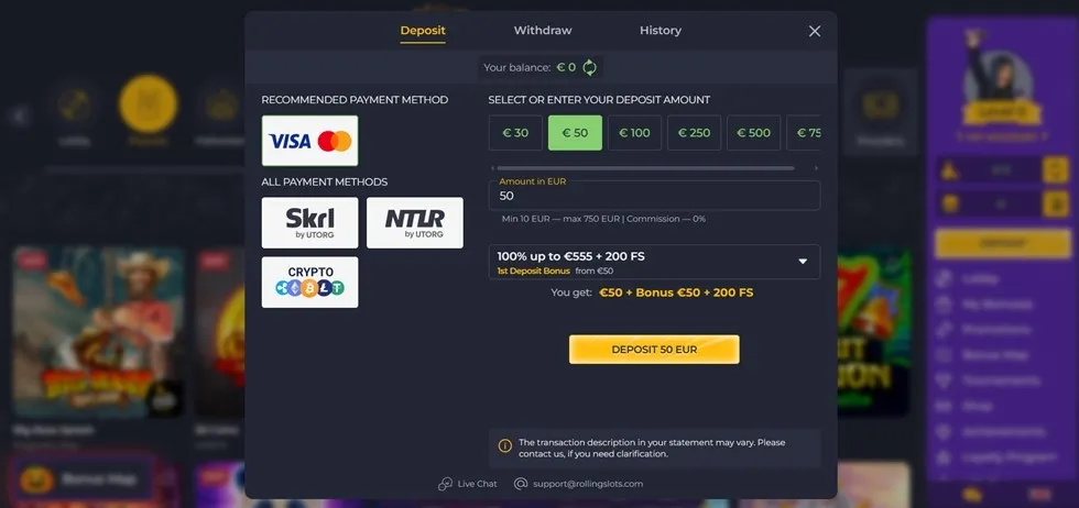 Во ова казино ќе најдете разумни ограничувања. Па така, ако сакате ниска уплата може да користите банкарски картички и е-паричници со минимум депозит од 10 евра. За неограничени уплати користете криптовалути.